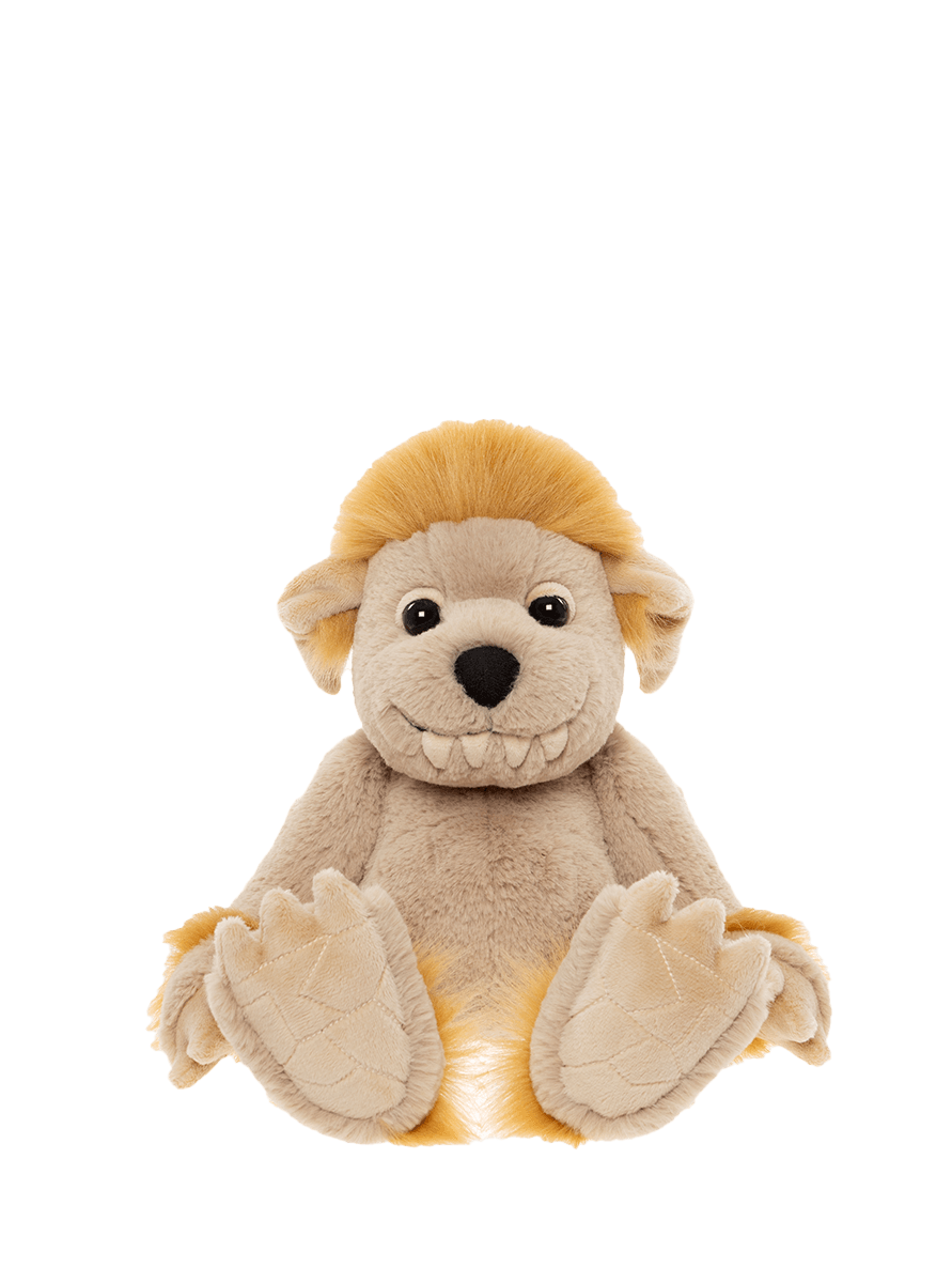 Crafted from the softest beige plush with warm orange fur accents, Bedrock’s playful personality shines through his tufted hair, cheerful grin, and oversized paws. Whether he’s joining in imaginative play or simply snuggling up for a nap, this gentle giant brings a reassuring presence wherever he goes. With his non-jointed design and machine-washable material, Bedrock is easy to care for and built to be a lasting companion for years to come.